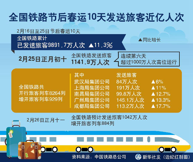 2月26日,全國鐵路發(fā)送旅客1084萬人次,客流略有回落但仍保持高位運行,已連續(xù)七天超過1000萬人次;春運同比增加145.5萬人次,增長15.5%,為今年春運以來同比增幅最大的一天。全國鐵路共開行旅客列車8155列,增開旅客列車884列。武漢局集團(tuán)公司當(dāng)日發(fā)送旅客78.3萬人次,同比增長8.5%;上海局集團(tuán)公司發(fā)送旅客185.6萬人次,同比增長15.2%;南昌局集團(tuán)公司發(fā)送旅客92.5萬人次,同比增長12.7%;廣州局集團(tuán)公司發(fā)送旅客137.5萬人次,同比增長16.8%;成都局集團(tuán)公司發(fā)送旅客108.6萬人次,同比增長18.8%。
