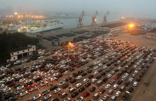 ▲ 2月22日,汽車在??谑行阌⒏鄹蹍^(qū)內排隊等待出島。新華社記者趙穎全攝