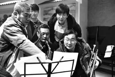 在馬莊村文化禮堂,農(nóng)民樂團的成員在排練時討論樂譜。新華社發(fā)