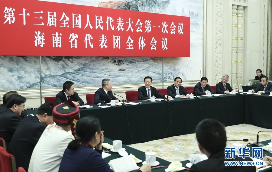 韓正在海南代表團(tuán)參加審議。在認(rèn)真聽(tīng)取劉賜貴、沈曉明、陳飄等代表發(fā)言后,韓正說(shuō),完全贊同全國(guó)人大常委會(huì)工作報(bào)告。報(bào)告圍繞中心、突出重點(diǎn)、客觀實(shí)在,通篇貫穿了習(xí)近平新時(shí)代中國(guó)特色社會(huì)主義思想,體現(xiàn)了堅(jiān)持黨的領(lǐng)導(dǎo)、人民當(dāng)家作主、依法治國(guó)的有機(jī)統(tǒng)一。韓正說(shuō),海南在國(guó)家發(fā)展全局中地位作用更顯重要,要以習(xí)近平新時(shí)代中國(guó)特色社會(huì)主義思想為指導(dǎo),落實(shí)黨中央決策部署和習(xí)近平總書(shū)記對(duì)海南發(fā)展的重要指示精神,以慶祝改革開(kāi)放40周年和海南建省辦經(jīng)濟(jì)特區(qū)30周年為契機(jī),以國(guó)際旅游島建設(shè)為總抓手,把保護(hù)生態(tài)環(huán)境放在優(yōu)先位置,加快建設(shè)經(jīng)濟(jì)繁榮、社會(huì)文明、生態(tài)宜居、人民幸福的美好新海南。