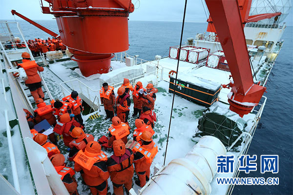 3月22日,“雪龍”號極地考察船上舉行的應急消防棄船演練中,全體隊員穿上救生衣迅速到救生艇甲板集合待命。新華社記者 白國龍 攝
