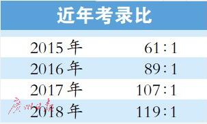 記者查詢近年廣州市公務員考試的數(shù)據(jù)發(fā)現(xiàn),近幾年競爭越發(fā)激烈,2015年計劃招錄738人,44825人成功通過審核并繳費,61∶1的平均考錄競爭比已經(jīng)高出歷史平均水平。2016年,廣州市公務員考試計劃招錄1090人,成功報名人數(shù)為97182人,平均考錄競爭比約為89∶1。到了2017年,廣州市公務員考試分為廣州和北京“雙考區(qū)”進行,計劃招錄924人,成功報名人數(shù)為99038人,平均考錄競爭比約為107∶1,競爭激烈程度超越往年。2018年廣州市公務員考試恢復單考區(qū),共設592個職位,計劃招錄722人,比起去年大幅減少,但有85770人成功報名,平均考錄競爭比達到119∶1,幾乎是2015年61∶1考錄競爭比的兩倍。