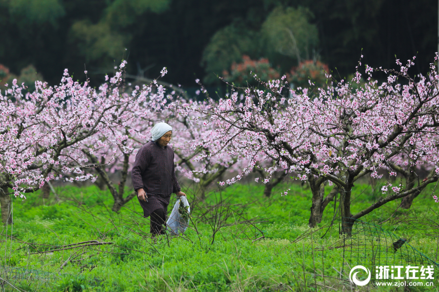 3月25日,浙江省寧波市橫溪鎮(zhèn)生態(tài)農(nóng)業(yè)園工作人員在桃花林內(nèi)勞作。
