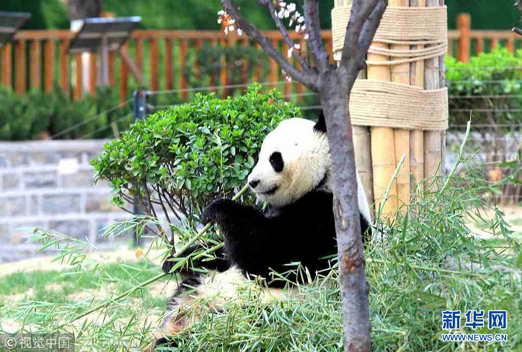 3月27日,山東濟(jì)南春暖花開,動(dòng)物園內(nèi)熊貓?jiān)趫@中散步吃美食享受春天美好陽光。(圖片來源:視覺中國)