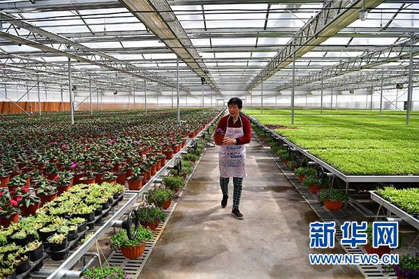 一名女工在秦漢鮮花港的大棚內(nèi)查看花草長(zhǎng)勢(shì)(3月27日攝)。新華社記者 邵瑞 攝