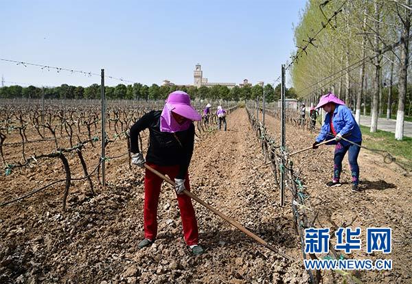 工人在陜西張?jiān)H鹉浅潜ぞ魄f的葡萄園內(nèi)鋤草(3月27日攝)。新華社記者 邵瑞 攝