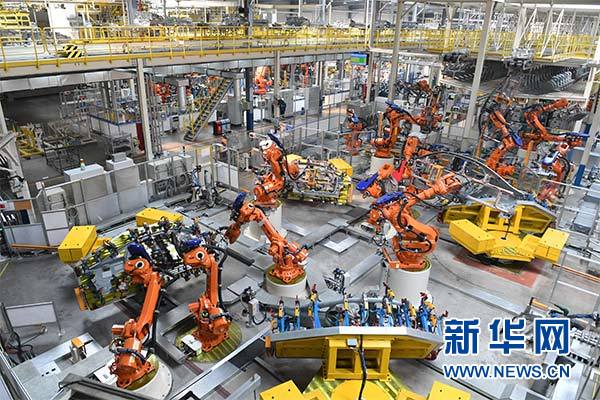 3月27日,焊接機器人在浙江臨海的吉利汽車生產(chǎn)車間工作。新華社記者 殷博古 攝