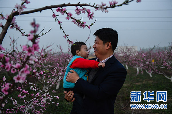 在泗陽縣南劉集鄉(xiāng)趙陳村“桃花源記”項目桃林前,市民帶著孩子賞花(3月31日攝)。新華社記者 季春鵬 攝