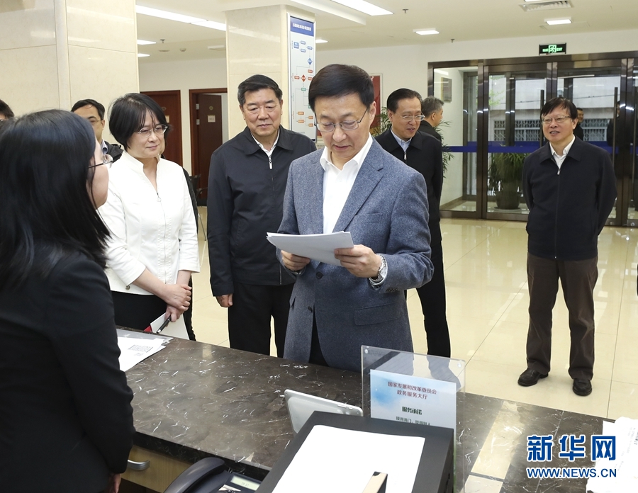 4月3日,中共中央政治局常委、國務院副總理韓正到國家發(fā)展改革委調(diào)研并主持召開座談會。這是韓正在國家發(fā)展改革委政務服務大廳考察。新華社記者 龐興雷 攝