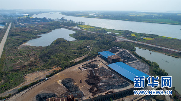 這是3月29日用無人機(jī)拍攝的安徽貴池前江工業(yè)園內(nèi)池州恒鑫材料科技有限公司廠區(qū)內(nèi)的長江堤岸旁傾倒的選礦尾渣。新華社記者 郭晨 攝