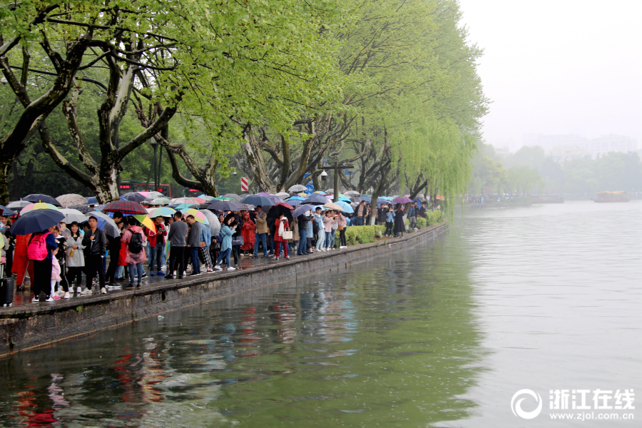 4月5日,清明小長假首日,杭州細(xì)雨綿綿,西湖景區(qū)游客絡(luò)繹不絕。杭城雖降雨降溫,但西湖景區(qū)前來賞花踏青的游客如潮,斷橋似人橋。(浙江在線拍友 里爾 柱子 攝)