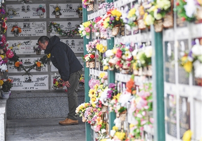 4月5日,市民前往萬安公墓祭奠。將骨灰盒放入墻內(nèi)骨灰格的立體安葬方式,成為眾多家庭的選擇。新京報記者 陶冉 攝