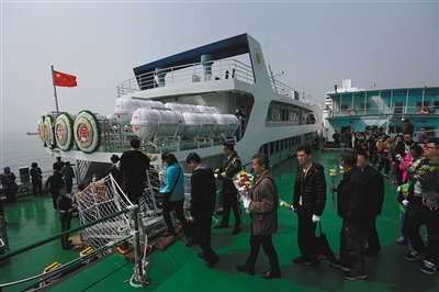 2018年4月2日,天津市濱海新區(qū)國際郵輪母港碼頭,全國首艘骨灰海撒專用船“國賓9號”首航,來自北京的逝者親屬們正排隊登船。新京報記者 王飛 攝