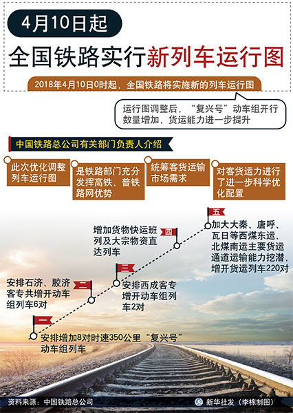 2018年4月10日0時起,全國鐵路將實施新的列車運行圖。運行圖調(diào)整后,“復興號”動車組開行數(shù)量增加,貨運能力進一步提升。新圖實施后,北京至上海間通過壓縮停站,實現(xiàn)最快4小時18分可達,較調(diào)圖前壓縮6分鐘。>>>