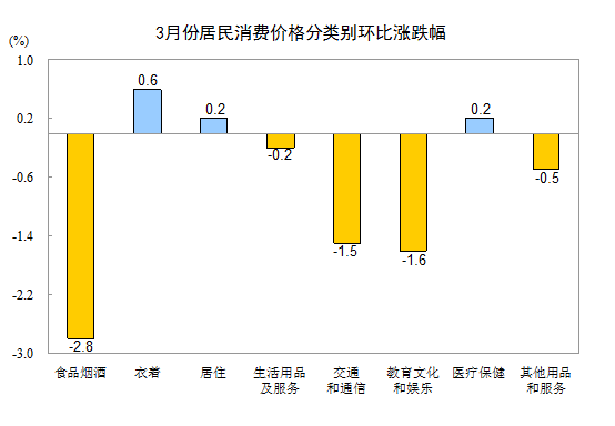 3月份,全國居民消費(fèi)價(jià)格環(huán)比下降1.1%。其中,城市下降1.1%,農(nóng)村下降1.2%;食品價(jià)格下降4.2%,非食品價(jià)格下降0.4%;消費(fèi)品價(jià)格下降1.4%,服務(wù)價(jià)格下降0.7%。
