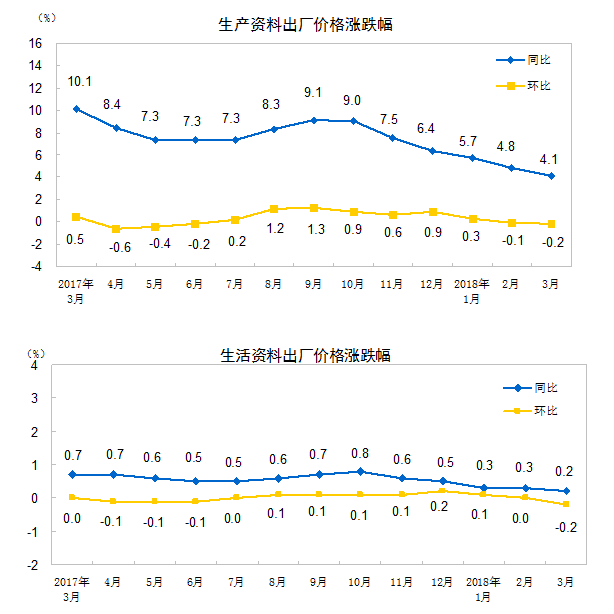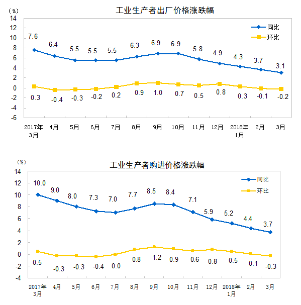 2018年3月份,全國工業(yè)生產(chǎn)者出廠價格同比上漲3.1%,環(huán)比下降0.2%。工業(yè)生產(chǎn)者購進價格同比上漲3.7%,環(huán)比下降0.3%。一季度,工業(yè)生產(chǎn)者出廠價格同比上漲3.7%,工業(yè)生產(chǎn)者購進價格同比上漲4.4%。
