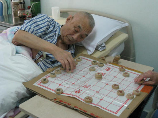 德勝社區(qū)衛(wèi)生服務(wù)中心臨終關(guān)懷科一位正在下象棋的老爺爺。該科室護(hù)士長(zhǎng)劉曉惠說(shuō),這位老爺爺唯一的愛好就是下象棋,“要是下跳棋我們還能陪一陪,象棋都不會(huì)”。于是,醫(yī)院便找了一位會(huì)下棋的護(hù)工陪這位老爺爺下象棋。圖片中下象棋用的硬紙板也是護(hù)士們幫忙做的。德勝社區(qū)衛(wèi)生服務(wù)中心臨終關(guān)懷科供圖