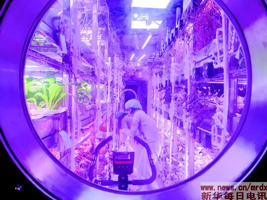 照片中紫紅色的光是根據(jù)植物生長狀況調(diào)節(jié)而成的人造光源,控制了植物的生長速率,也就保證了實(shí)驗(yàn)艙內(nèi)氧氣的含量。