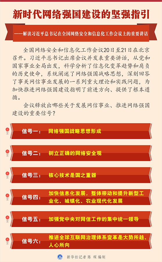 全國網(wǎng)絡(luò)安全和信息化工作會(huì)議20日至21日在北京召開。習(xí)近平總書記出席會(huì)議并發(fā)表重要講話,從黨和國家事業(yè)全局出發(fā),科學(xué)分析了信息化變革趨勢和肩負(fù)的歷史使命,系統(tǒng)闡述了網(wǎng)絡(luò)強(qiáng)國戰(zhàn)略思想,深刻回答了事關(guān)網(wǎng)信事業(yè)發(fā)展的一系列重大理論和實(shí)踐問題,為加快推進(jìn)網(wǎng)絡(luò)強(qiáng)國建設(shè)指明了前進(jìn)方向、提供了根本遵循。