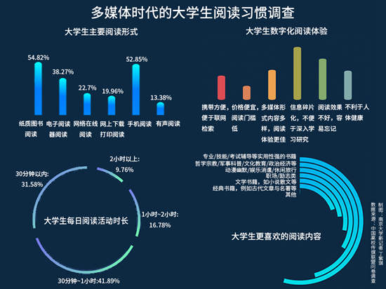 中國高校傳媒聯(lián)盟調(diào)查結(jié)果顯示,在閱讀時(shí)長上,31.58%的受訪大學(xué)生日均閱讀時(shí)長不足半小時(shí),41.89%的受訪者日均閱讀時(shí)長在半小時(shí)到一小時(shí)之間,閱讀時(shí)長在2小時(shí)以上的占9.76%。