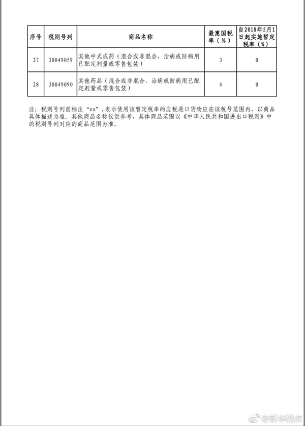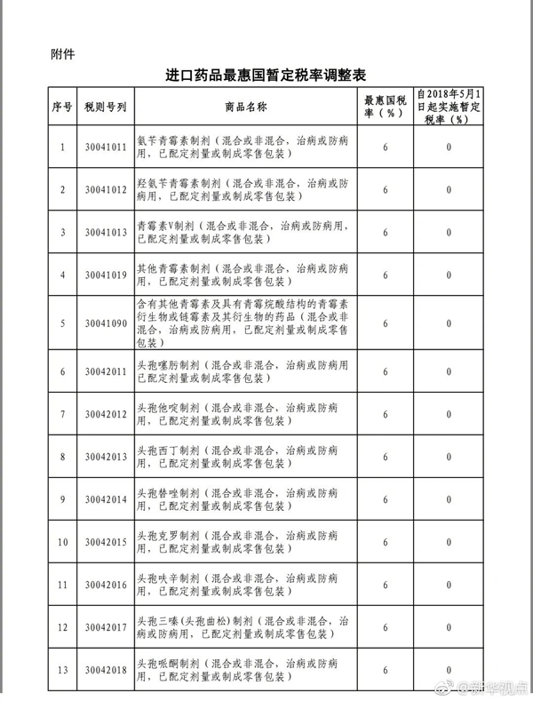 新華網(wǎng)北京4月23日電 財政部關(guān)稅司23日發(fā)布消息,5月1日起我國將取消包括抗癌藥在內(nèi)的28項藥品進(jìn)口關(guān)稅。調(diào)整后,除安宮牛黃丸等我國特產(chǎn)藥品、部分生物堿類藥品等少數(shù)品種外,絕大多數(shù)進(jìn)口藥品,特別是有實際進(jìn)口的抗癌藥均將實現(xiàn)零關(guān)稅。(記者郁瓊源) ????(據(jù)新華社“新華視點”微博報道)?