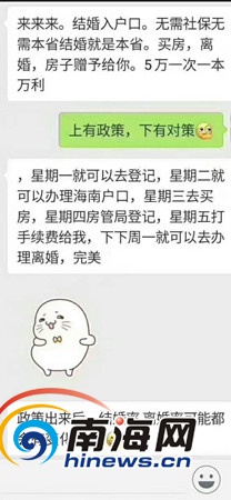 海南部分群眾微信朋友圈中流傳“登記結(jié)婚就可立即辦理落戶海南”的傳言、段子,公安、民政表示此類說法不可能實現(xiàn)。微信朋友圈截圖