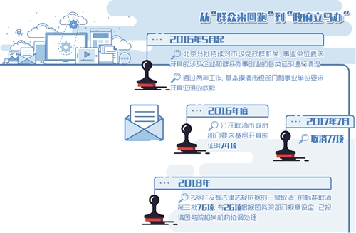 不久前,北京在此前分兩批取消151項市級部門設(shè)定的企業(yè)群眾辦事創(chuàng)業(yè)證明基礎(chǔ)上,再次取消76項證明事項,涉及企業(yè)設(shè)立、經(jīng)營許可、困難救助、就讀升學(xué)等各方面。