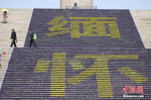 資料圖:3月26日,南京雨花臺烈士陵園內(nèi)的烈士紀念碑前布置了由數(shù)萬盆鮮花組成的“緬懷”花壇,以此表達對革命英烈的紀念之情。 中新社記者 泱波 攝