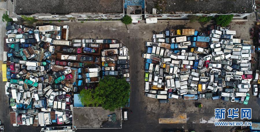 廣州市金屬回收有限公司購(gòu)銷部堆放的報(bào)廢汽車(4月17日無(wú)人機(jī)拍攝)。新華社記者 鄧華 攝