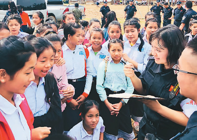 4月26日,在老撾南塔省勐龍縣班相果中學,云南省公安邊防總隊醫(yī)院工作人員正在和學生交流。張敏 攝