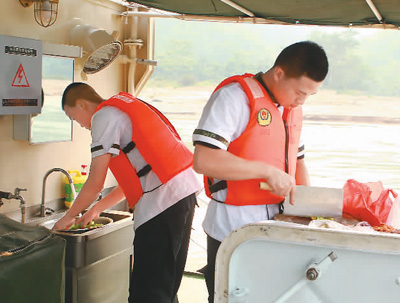 聯(lián)合巡邏執(zhí)法中,吃飯睡覺都在船艇上。做飯是由船艇上的執(zhí)法人員輪流來做。圖為53911艇上負責做飯的執(zhí)法人員在洗菜切菜。記者 張一琪 攝