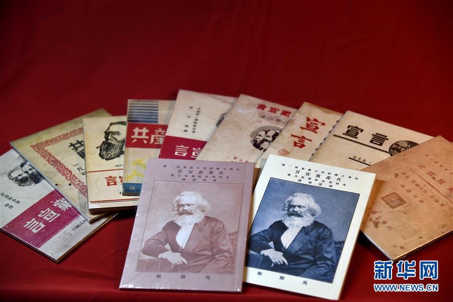 這是廣饒縣《共產(chǎn)黨宣言》紀念館收藏的早期多個版本《共產(chǎn)黨宣言》復(fù)制本(4月12日攝)。新華社記者 郭緒雷 攝