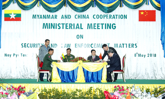 5月8日,國務(wù)委員、公安部部長趙克志在內(nèi)比都與緬甸內(nèi)政部部長覺瑞舉行會(huì)談。圖為會(huì)談后,雙方簽署有關(guān)合作文件。