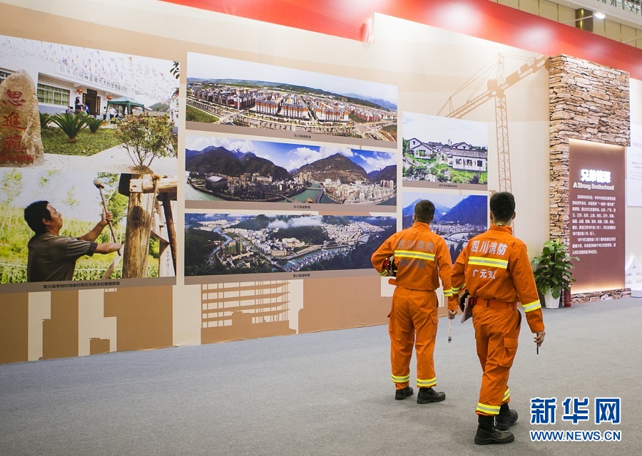 5月10日,兩名消防人員在成就展上參觀。當(dāng)日,“5·12汶川特大地震災(zāi)區(qū)發(fā)展振興成就展”在成都正式開展。該展覽用300余張照片、130余件套實(shí)物,全方位展示了汶川地震災(zāi)區(qū)十年來發(fā)展振興所取得的歷史成就和城鄉(xiāng)面貌變化。新華社記者 張帆 攝