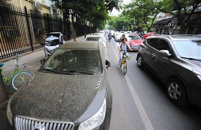 昨日,靈境胡同,機(jī)動(dòng)車(chē)長(zhǎng)時(shí)間停放車(chē)身已落滿(mǎn)灰塵,自行車(chē)道被占,騎車(chē)市民只能走機(jī)動(dòng)車(chē)車(chē)道。新京報(bào)記者 王貴彬 攝