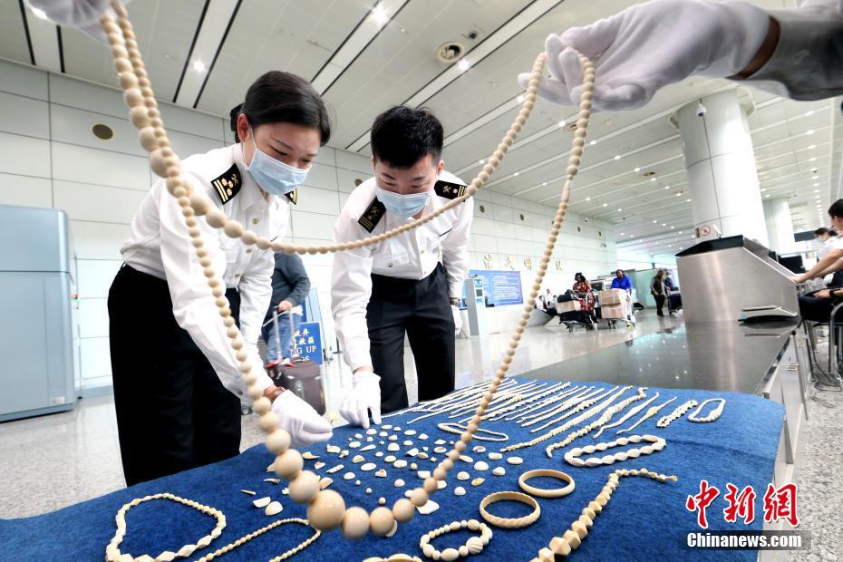 4月11日,廣州海關(guān)通報(bào),1-3月,該關(guān)在空港旅檢渠道共查獲象牙走私案件62宗,涉及象牙及制品24.16千克,同比分別增長1.38倍、2倍。圖為近日海關(guān)關(guān)員清點(diǎn)查獲的走私象牙制品。中新社記者 池兆恩 攝