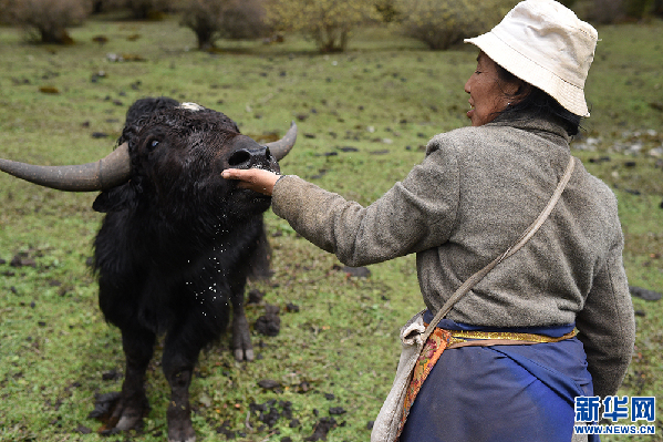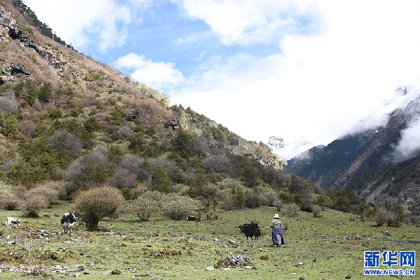 卓嘎在山上喂牛(5月9日攝)。新華網(wǎng)記者 馬藝萌 攝