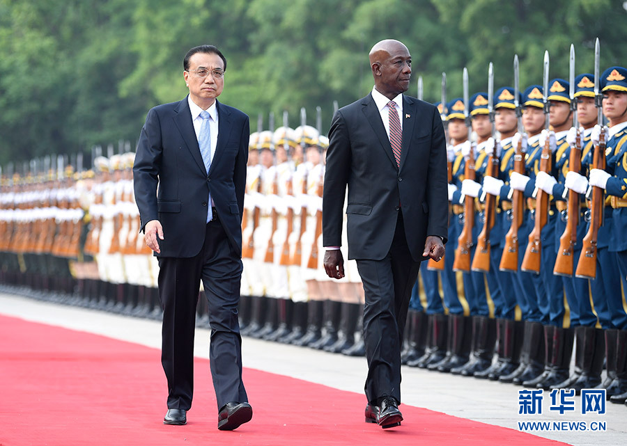 5月14日,國務(wù)院總理李克強(qiáng)在北京人民大會堂同來華進(jìn)行正式訪問的特立尼達(dá)和多巴哥總理羅利舉行會談。會談前,李克強(qiáng)在人民大會堂東門外廣場為羅利舉行歡迎儀式。新華社記者 燕雁 攝