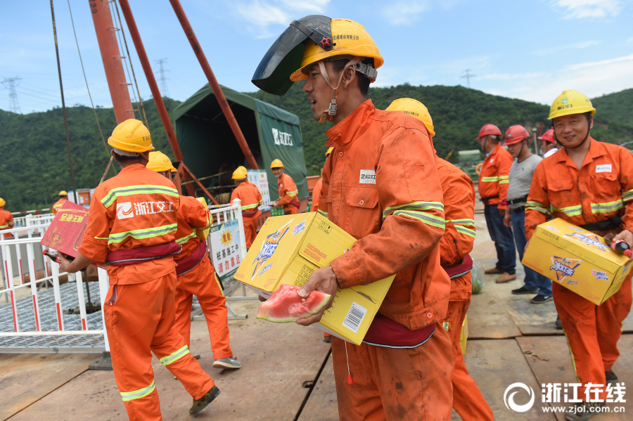 5月16日,杭州持續(xù)高溫,最高氣溫達(dá)37.5℃。在G25長(zhǎng)深高速德清至富陽(yáng)段擴(kuò)容工地,工人正在抓緊建設(shè)跨富春江大橋。承建施工項(xiàng)目的浙江交工宏途交通建設(shè)有限公司,為一線(xiàn)建設(shè)者送來(lái)了清涼用品和防暑藥品,慰問(wèn)高溫下作業(yè)的施工人員。(浙江在線(xiàn)記者 吳元峰 攝)