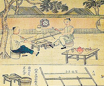 清代李澄淵在光緒十七年(1891年)應(yīng)英國醫(yī)士畢索普要求畫了一組《玉作圖》?!队褡鲌D》細(xì)致描繪了從搗沙研漿、開玉、解玉、粗磨、細(xì)磨、掏膛、磨琢紋飾等到最后拋光的各個制作環(huán)節(jié)的場景。