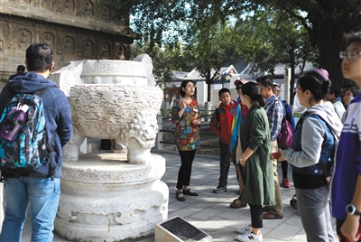 2017年10月,北京石刻藝術(shù)博物館館員在研究之余還免費(fèi)為觀眾講解。據(jù)悉,新出臺(tái)的《博物館服務(wù)規(guī)范》對(duì)博物館講解服務(wù)作出規(guī)范,要求講解員講解時(shí)應(yīng)與觀眾互動(dòng)交流,并解答觀眾問(wèn)題。新京報(bào)記者 浦峰 攝