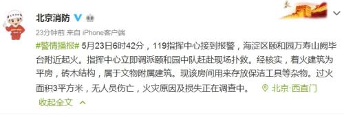 據(jù)北京市公安局消防局官方微博消息,5月23日6時(shí)42分,119指揮中心接到報(bào)警,海淀區(qū)頤和園萬(wàn)壽山闕畢臺(tái)附近起火。指揮中心立即調(diào)派頤和園中隊(duì)趕赴現(xiàn)場(chǎng)撲救。