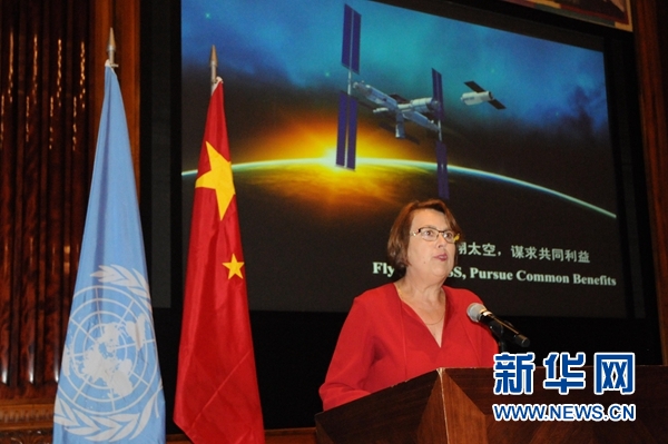 5月28日,在奧地利首都維也納,聯(lián)合國外層空間事務(wù)辦公室主任西莫內(nèi)塔·迪皮波在公告發(fā)布儀式上講話。新華社記者劉向攝