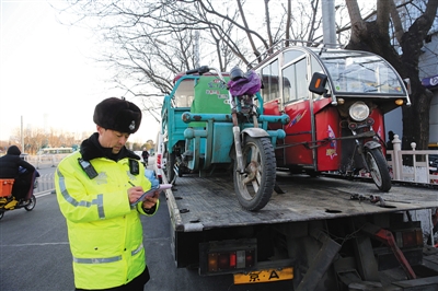 2017年12月13日,崇文門路口交警在登記被查扣上路行駛的非法機(jī)動(dòng)三輪車和電動(dòng)三輪車。新京報(bào)記者 王貴彬 攝