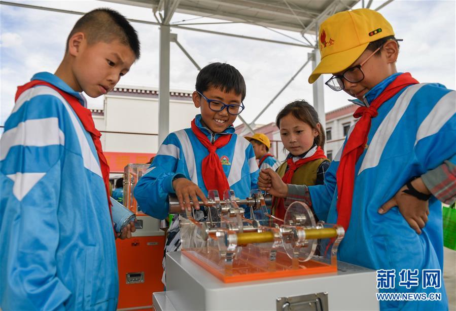 幾名學(xué)生在拉薩市流動(dòng)科技館巡展活動(dòng)現(xiàn)場體驗(yàn)科學(xué)小實(shí)驗(yàn)(5月24日攝)。 新華社記者 劉東君 攝