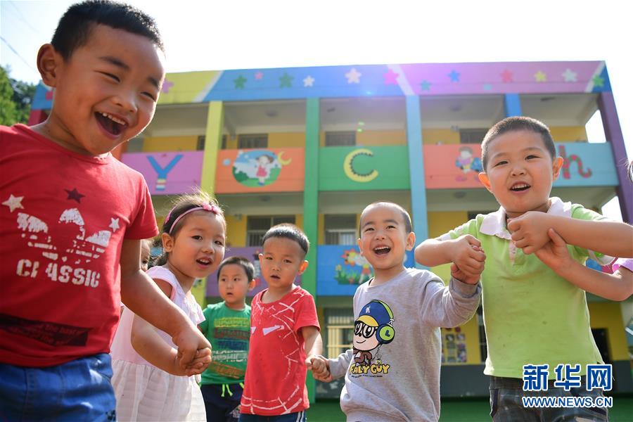 陜西省安康市漢濱區(qū)雙龍鎮(zhèn)杜壩村五四小學(xué)附設(shè)幼兒園小朋友們?cè)诓賵錾献鲇螒颍?017年6月16日攝)。這個(gè)幼兒園使用貸款資金翻修改造而成,有效解決了該村及周邊兒童學(xué)前教育缺失的問題。新華社記者 邵瑞 攝