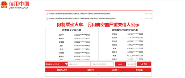 6月1日,中國鐵路客戶服務中心(12306)網站、“信用中國”網站公示了31名經認定有嚴重失信行為將被限制乘坐火車人員名單。同時,5月31日,由民航局政策法規(guī)司發(fā)布的民航特定嚴重失信旅客名單已出爐,6月1日生效。86名旅客將因自己的失信行為,付出“禁止乘坐民航航班一年”的代價!查看更多>>