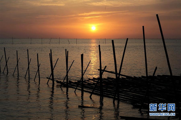 臺灣嘉義縣東石村連片的蚵架形成的“海田”被余暉浸染的景色(4月9日攝)。新華社記者林善傳攝