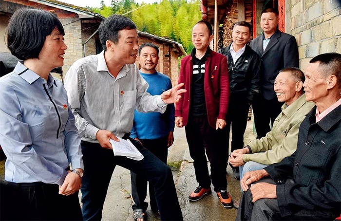 福建省邵武市紀(jì)檢干部(左一左二)在拿口鎮(zhèn)扁竹村向貧困戶了解生產(chǎn)生活以及扶貧資金發(fā)放情況 張國俊 攝