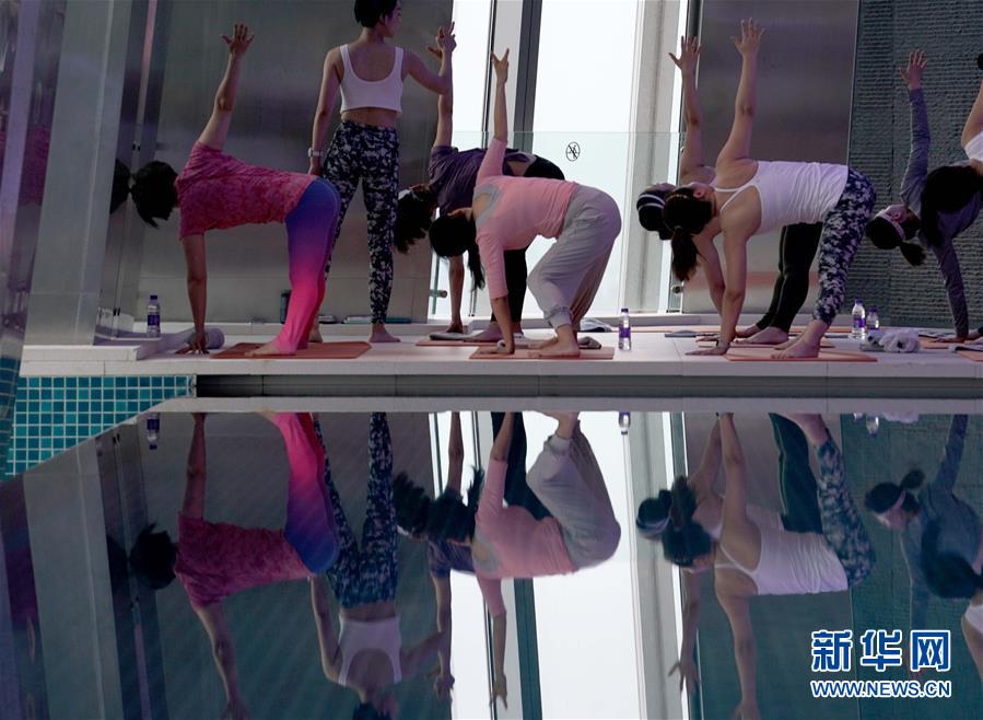 6月9日,在北京國貿大酒店78層游泳館,瑜伽愛好者練習瑜伽。